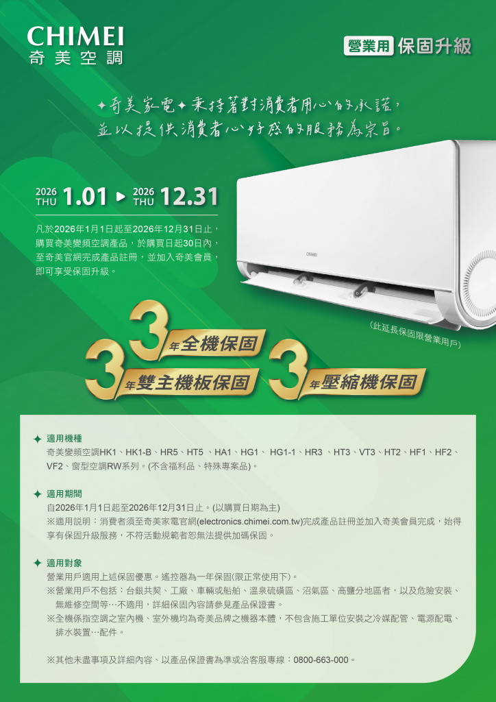 奇美家電秉持著對消費者用心的承諾,並以提供消費者心好感的服務為宗旨。凡於2026年1月1日起至2026年12月31日止,購買奇美變頻空調產品,於購買日起30日內,至奇美官網完成產品註冊,並加入奇美會員,即可享受保固升級。